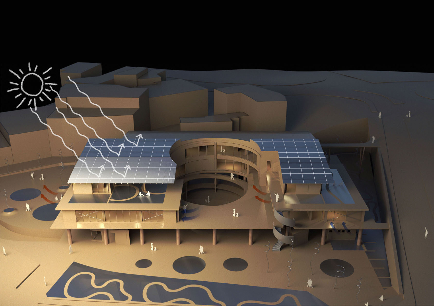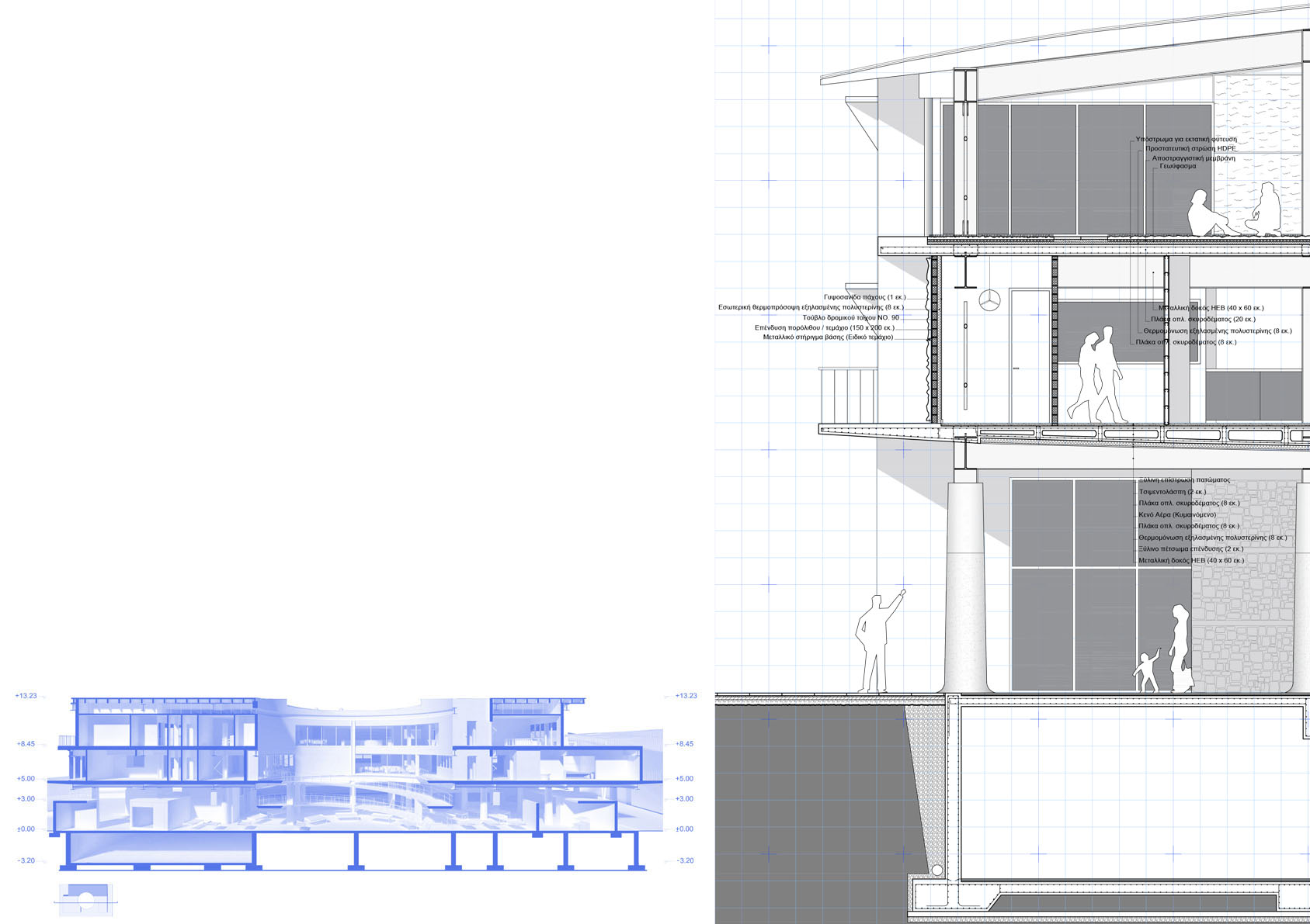 Η καλυπτόμενη επιφάνεια του κτιρίου είναι 2.240,66 τ.μ. καθιστώντας το κτίριο πλήρως επαρκές για το πρόγραμμα το οποίο καλείται να εξυπηρετήσει. Βάσει της αρχής της μικρότερης δυνατής δόμησης καταφέραμε να παράγουμε ένα κτίριο της τάξης των 4.143,46 τ.μ. στην ολότητά του. Στόχος ο οποίος επιτεύχθηκε από την επιλογή μας να προτείνουμε μία λύση με το χαμηλότερο δυνατό ενεργειακό αποτύπωμα. Γεγονός που σε συνδυασμό με την επιλογή φυσικών υλικών όπως πέτρα και πωρόλιθος, τον προσανατολισμό του όλου κτίσματος και της μορφής του εν γένει, θα βοηθήσει στην δημιουργία ενός καλύτερου μικροκλίματος για την περιοχή.